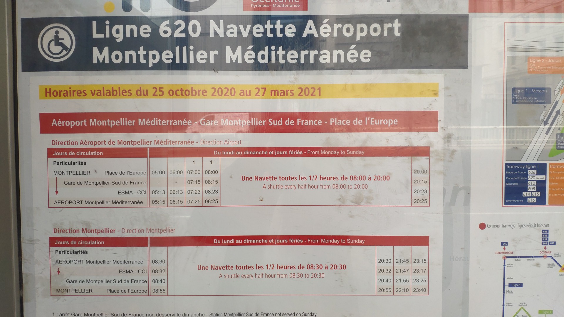 Le service 620 est un moyen pratique pour se rendre à l’aéroport. Il avait un arrêt supplémentaire à Montpellier Gare Sud de France. Les paiements par carte sont également acceptés (un voyage sur 4, j'ai cependant dû utiliser de l'argent liquide). Le prix du billet au moment de cet avis est de 1,60 EUR vers l'aéroport de Montpellier. Le trajet dure généralement moins de 30 minutes.